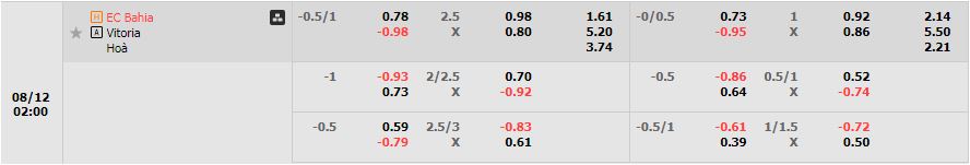 Bảng tỷ lệ kèo bóng đá Bahia vs Vitoria