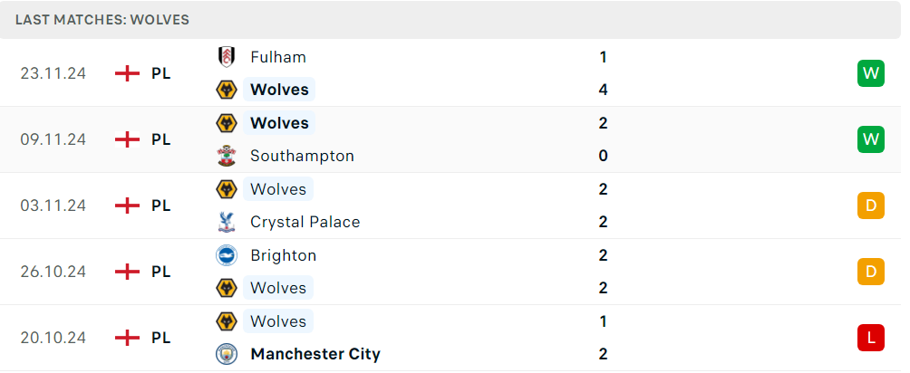 Wolves đang gặp nhiều vấn đề trong mùa giải năm nay. Đội bóng của Gary O’Neil xếp thứ 17 với chỉ 9 điểm sau 12 vòng đấu. Khả năng phòng ngự của họ tiếp tục là mối lo lớn khi để thủng lưới 28 bàn từ đầu mùa. Dù hàng công ghi được 20 bàn, hiệu suất này chưa đủ để bù đắp cho sự thiếu chắc chắn ở tuyến dưới. Phong độ gần đây có phần cải thiện với hai chiến thắng đậm trước Southampton và Fulham, nhưng việc đối đầu với các đội bóng chơi kỷ luật luôn là thử thách khó nhằn.