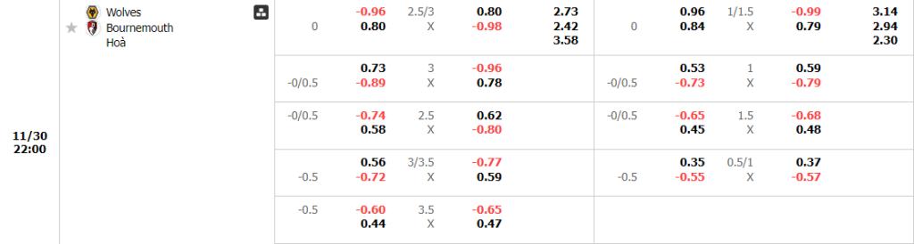Bảng tỷ lệ kèo bóng đá Wolves vs Bournemouth
